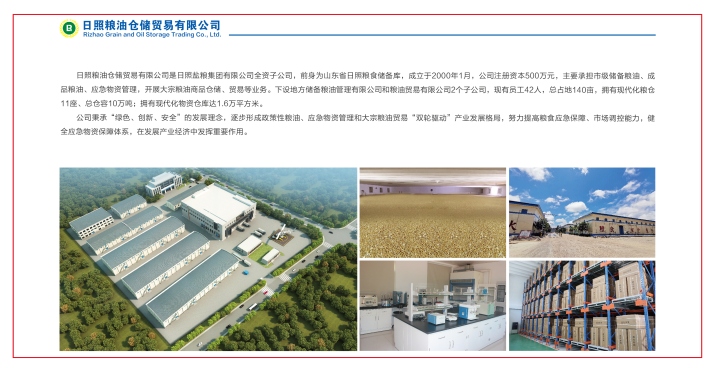 日照糧油倉儲貿(mào)易有限公司是日照鹽糧集團有限公司全資子公司,前身為山東省日照糧食儲備庫,成立于2000年1月,公司注冊資本500萬元,主要承擔市級儲備糧油、成品糧油、應急物資管理,開展大宗糧油商品倉儲、貿(mào)易等業(yè)務。下設日照市地方儲備糧油管理有限公司和山東日糧糧油...