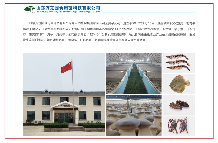 山東萬芝園食用菌科技有限公司是日照鹽糧集團有限公司全資子公司,成立于2012年8月10日,注冊資本3000萬元,現(xiàn)有干部職工65人,主要從事食用菌研發(fā)、種植、加工銷售與海水養(yǎng)殖兩個主打業(yè)務(wù)板塊,主導(dǎo)產(chǎn)品為杏鮑菇、多寶魚、梭子蟹、日本對蝦、南美白對蝦、海參、貝類...