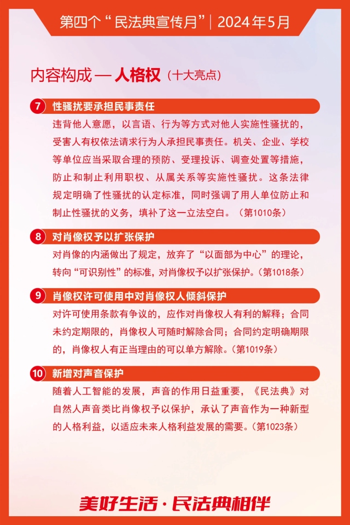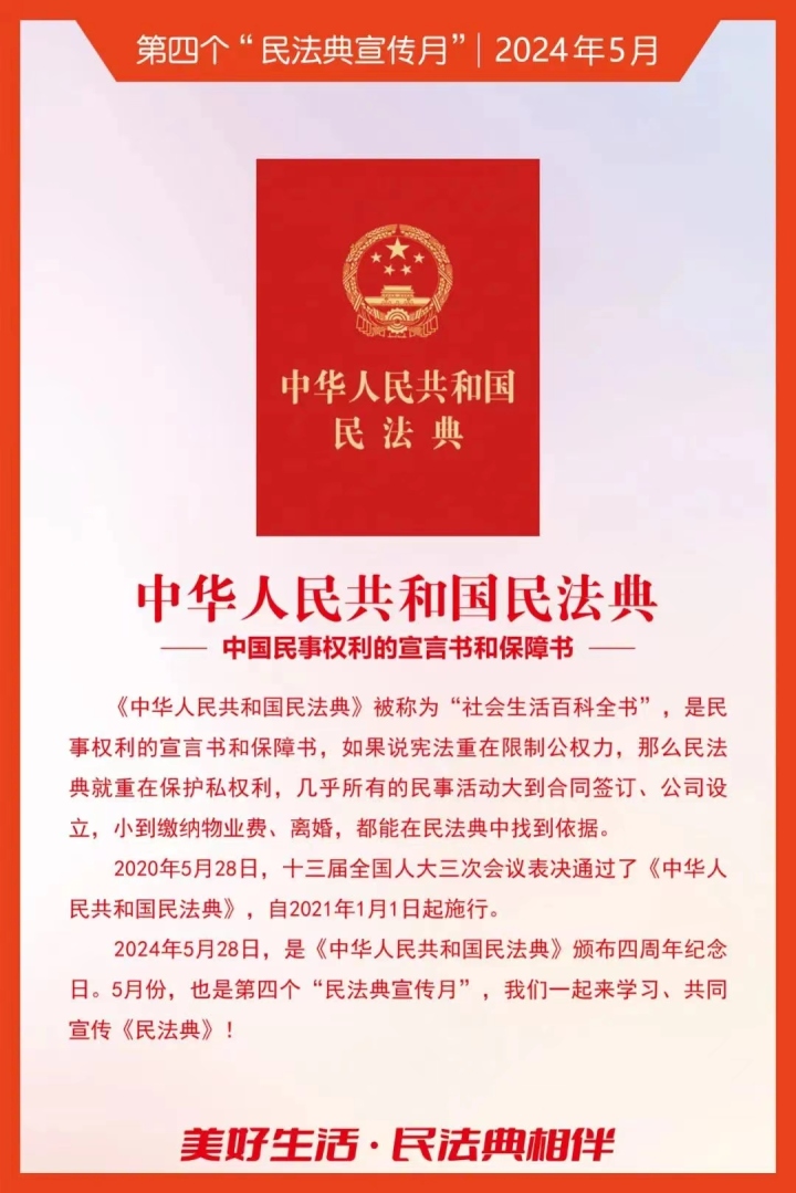 2020年5月28日,十三屆全國人大三次會議表決通過了《中華人民共和國民法典》,自2021年1月1日起施行。今年5月28日,是《中華人民共和國民法典》頒布四周年紀(jì)念日。今年5月是我國第四個民法典宣傳月。